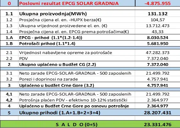 Drugim riječima, svaki uloženi evro u EPCG-Solar-Gradnjau donosi 5 evra koristi društvu. To je model investicije koji se rijetko viđa u energetskom sektoru.