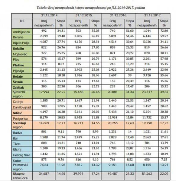 „Na nivou regiona, najveće stope nezaposlenosti na kraju 2017. godine evidentirane su u Andrijevici, Beranama i Plavu, kada je u pitanju Sjeverni region, zatim u Središnjem regionu Danilovgrad, Cetinje i Nikšić bilježe približno iste stope nezaposlenosti, koje su nešto veće od stope u Podgorici, dok među opštinama Primorskog regiona najveće stope nezaposlenosti su u Ulcinju i Baru. Najveće povećanje stope nezaposlenosti na kraju 2017. godine u odnosu na kraj 2016. godine zabilježene su u opštinama Plav i Andrijevica, dok su najveće pozitivne promjene, tj. smanjenja postignuta u Šavniku i Herceg Novom“, piše u Izvještaju.