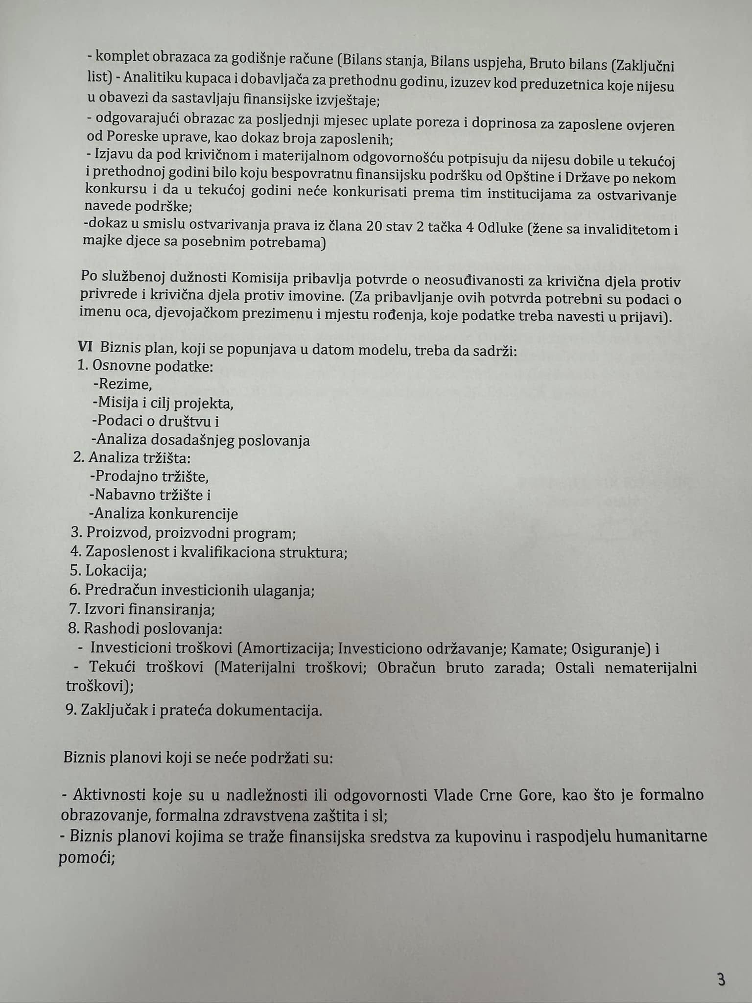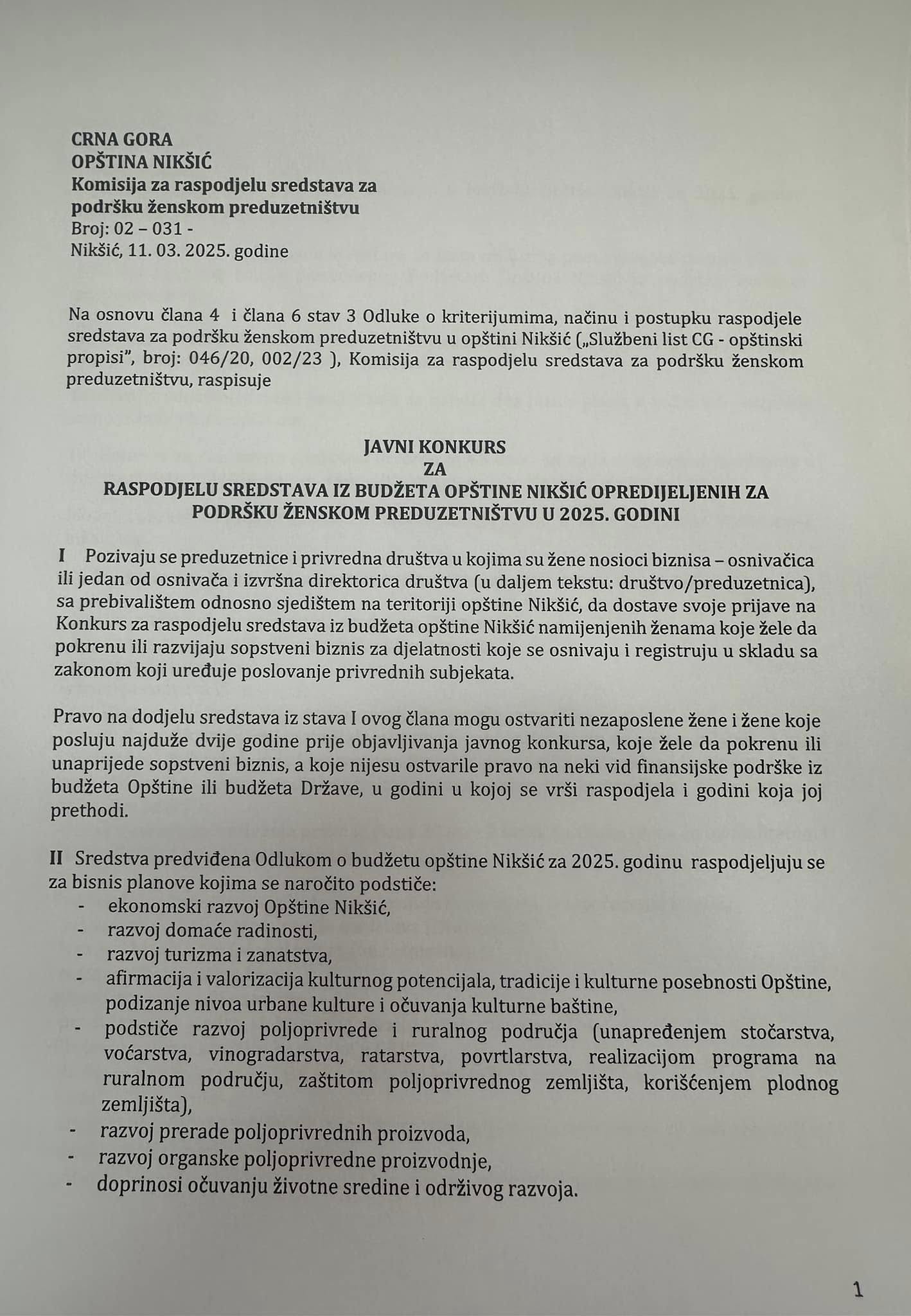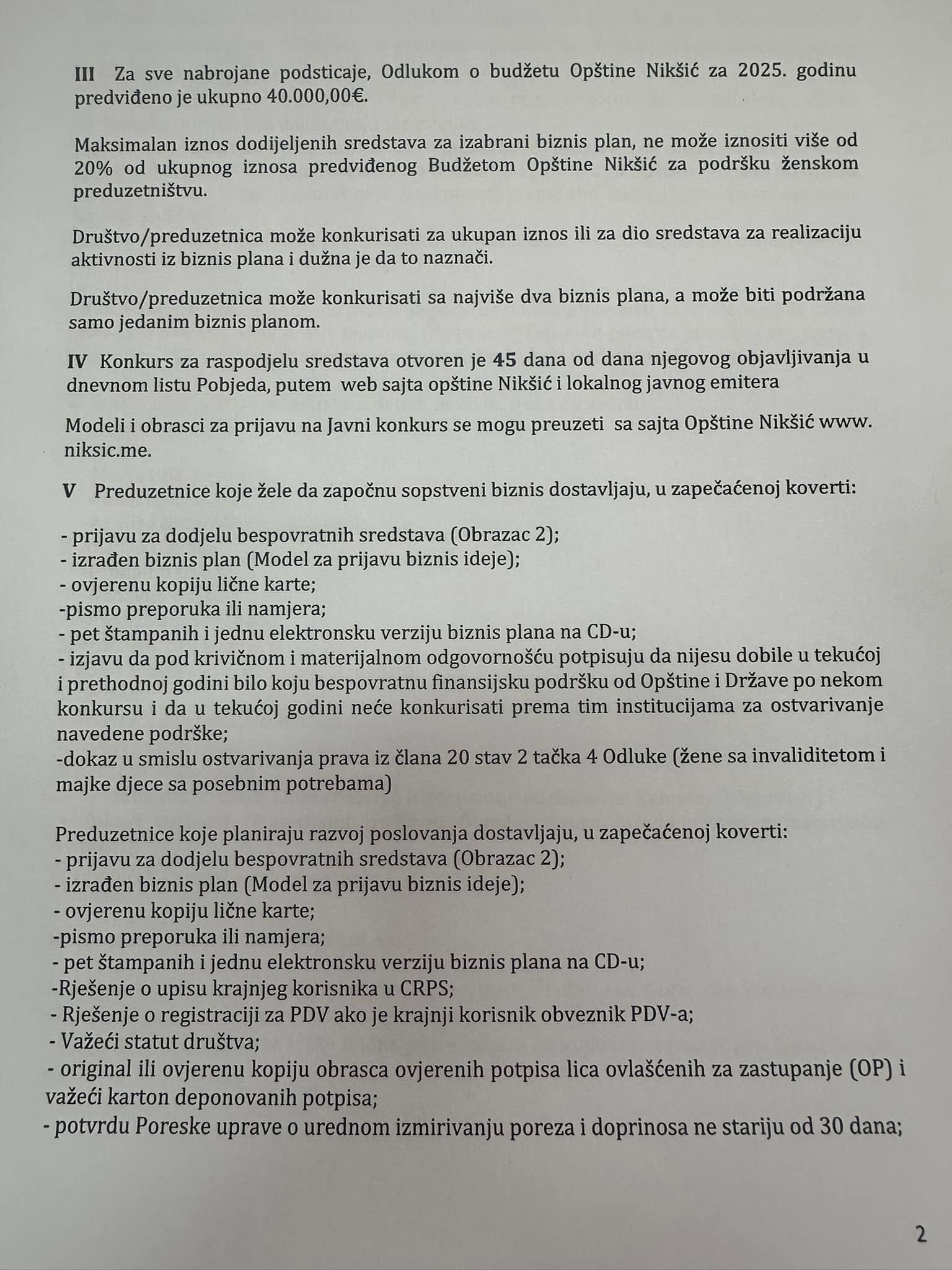 “Pravo na dodjelu sredstava iz stava mogu ostvariti nezaposlene žene i žene koje posluju najduže dvije godine prije objavljivanja javnog konkursa, koje žele da pokrenu ili unaprijede sopstveni biznis, a koje nijesu ostvarile pravo na neki vid finansijske podrške iz budžeta Opštine ili budžeta Države, u godini u kojoj se vrši raspodjela i godini koja joj prethodi”, navodi se u javnom pozivu.