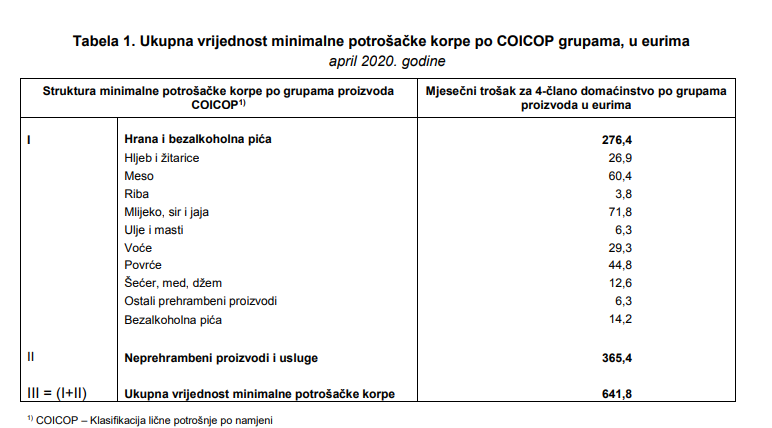 Vrijednost minimalne potrošačke korpe je zasnovana na podacima Ankete o potrošnji domaćinstava i preporukama