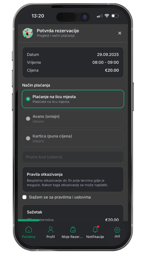 - Plaćanja u aplikaciji: vlasnici će moći da plaćaju uslugu karticom; korisnici će – prema odluci vlasnika terena moći da plate na licu mjesta, avansno dio iznosa ili cijeli termin unaprijed (posebno korisno za strance i turističku sezonu na primorju)