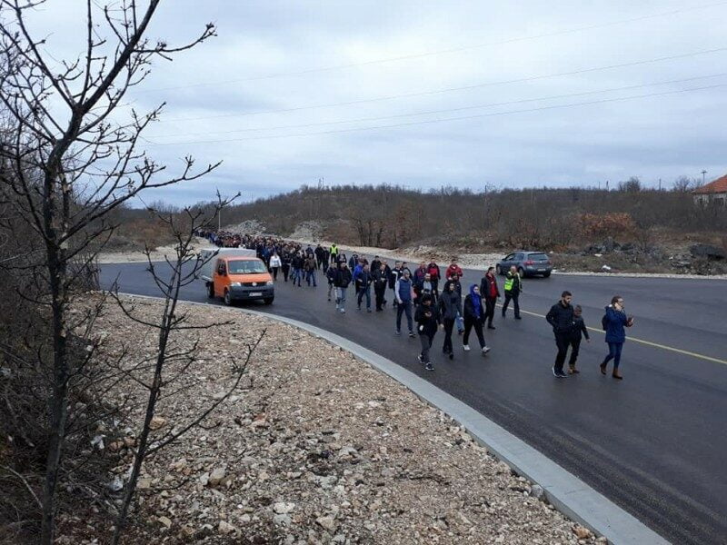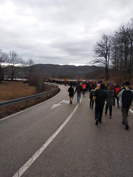 Oni su prije nešto više od sat vremena prošli raskrsnicu u Maočićima, gdje im se pridružilo nekoliko stotina mještana Velimlja i obližnjih sela.