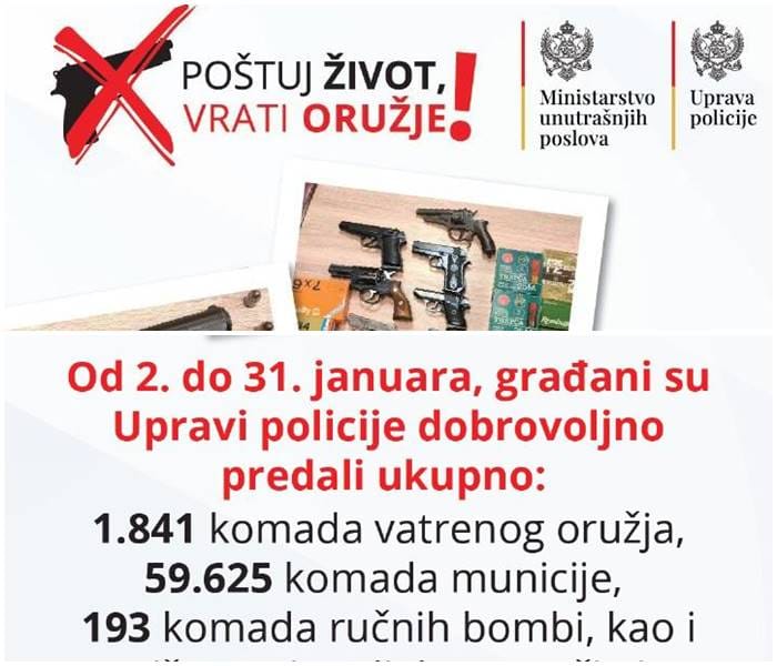 Od početka januara Upravi policije je dobrovoljno predato ukupno 1915 komada oružja, 63.450 komada municije, 201 komad ručnih bombi, kao i više stotina djelova oružja i eksplozivnih sredstava.