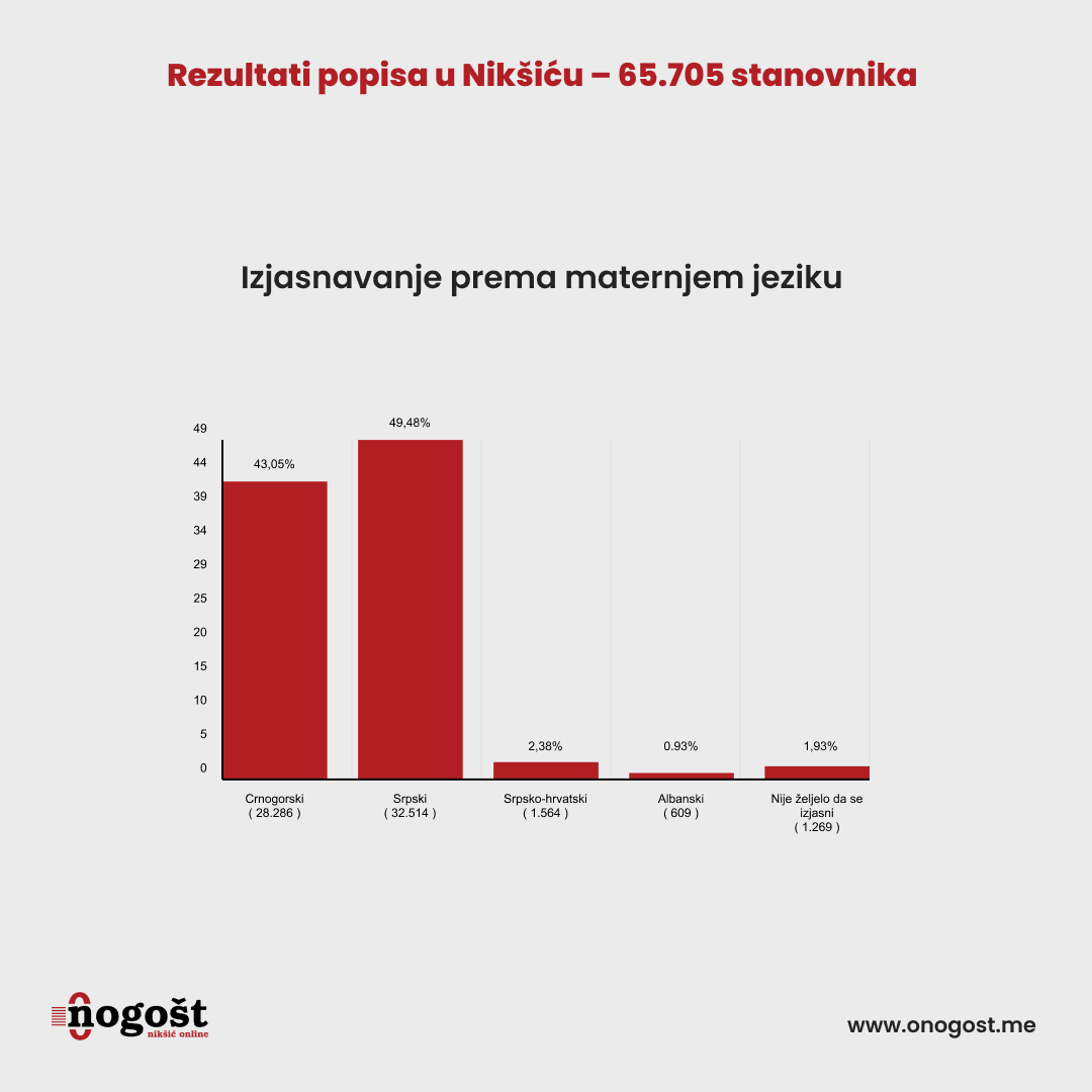Kada je u pitanju jezik, 28.286 stanovnika Nikšića ili 43,05 odsto govori crnogosrki, srpski priča 32.514 ili 49,48 odsto stanovnika naše opštine. Srpsko-hrvatski 1.564 ili 2,38 odsto građana, albanski njih 609 ili 0,93 odsto…