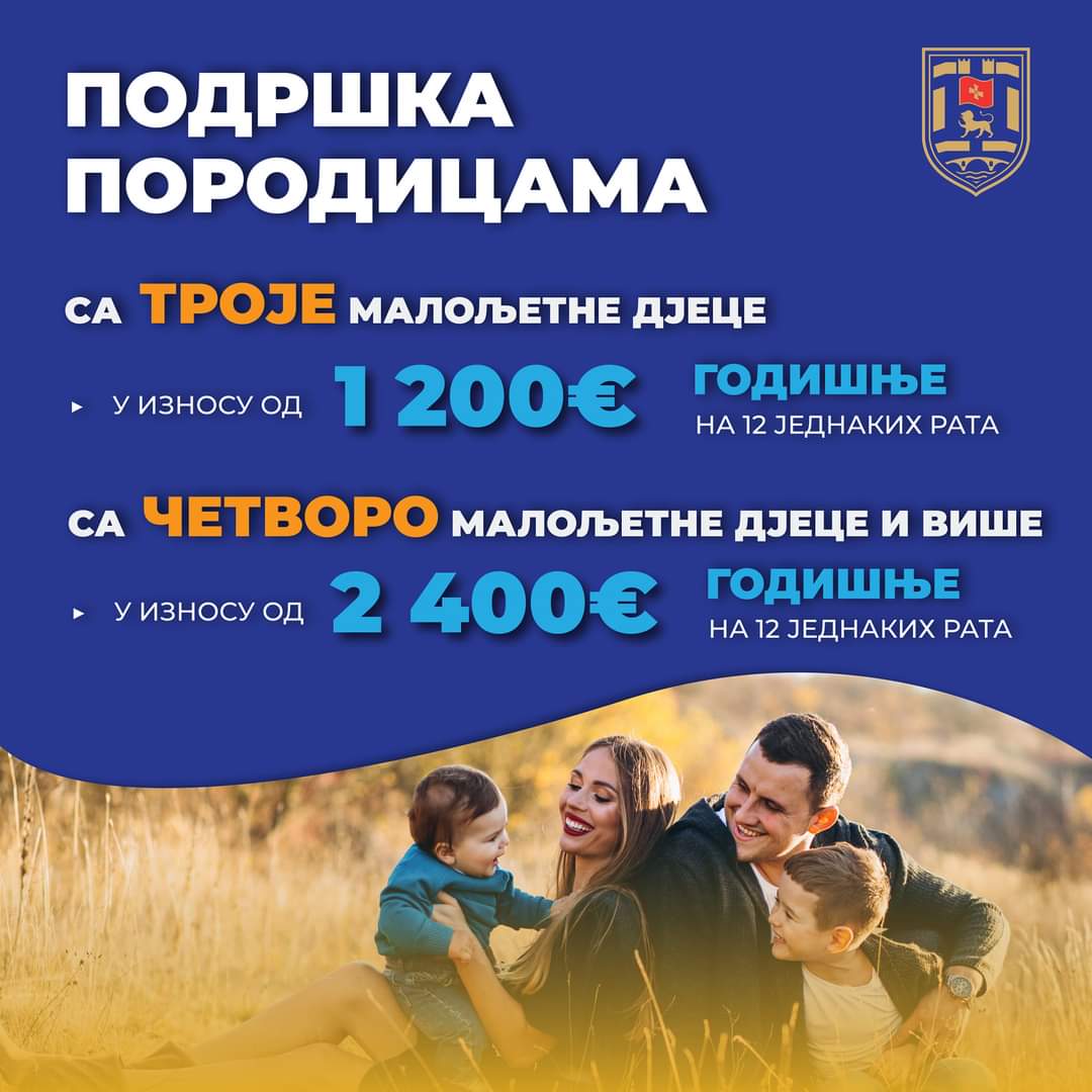 Opština Nikšić će porodice sa troje maloljetne djece podržati sa 1.200 eura na godišnjem nivou, a porodice sa četvoro maloljetne djece sa iznosom od 2.400 eura.
