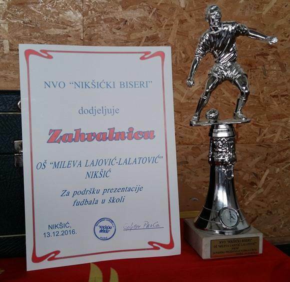 Nakon što je sa svojim saradnicima i ekipom najmlađeg uzrasta u sali za fizičku kulturu demonstrirao trening za male fudbalere, glavni trener FK „Nikšićki biseri“, Pavle Giljen, uručio je u ime pomenute NVO pehar i Zahvalnicu direktorici Škole, Veri Božović.
