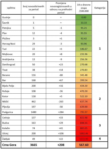Na osnovu svih registrovanih slučajeva obolijevanja u periodu od subote 03. oktobra u 00:00h do i zaključno sa petkom 16. oktobrom 2020. u 24:00 h, izračunate su vrijednosti 14-o dnevnih opštinskih stopa kumulativne incidencije za navedeni period i sačinjena lista opština u kojima će se sa primjenom mjera započeti po automatizmu od ponedeljka 19. oktobra u 00:00 sati.