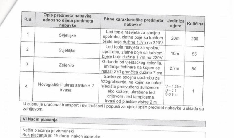 Za taj novac biće nabavljene svjetiljke za rasvjetu novogodišnjih jelki i ukrasa, a u cijenu je uračunat transport, svi troškovi i popusti za cjelokupan predmet nabavke.