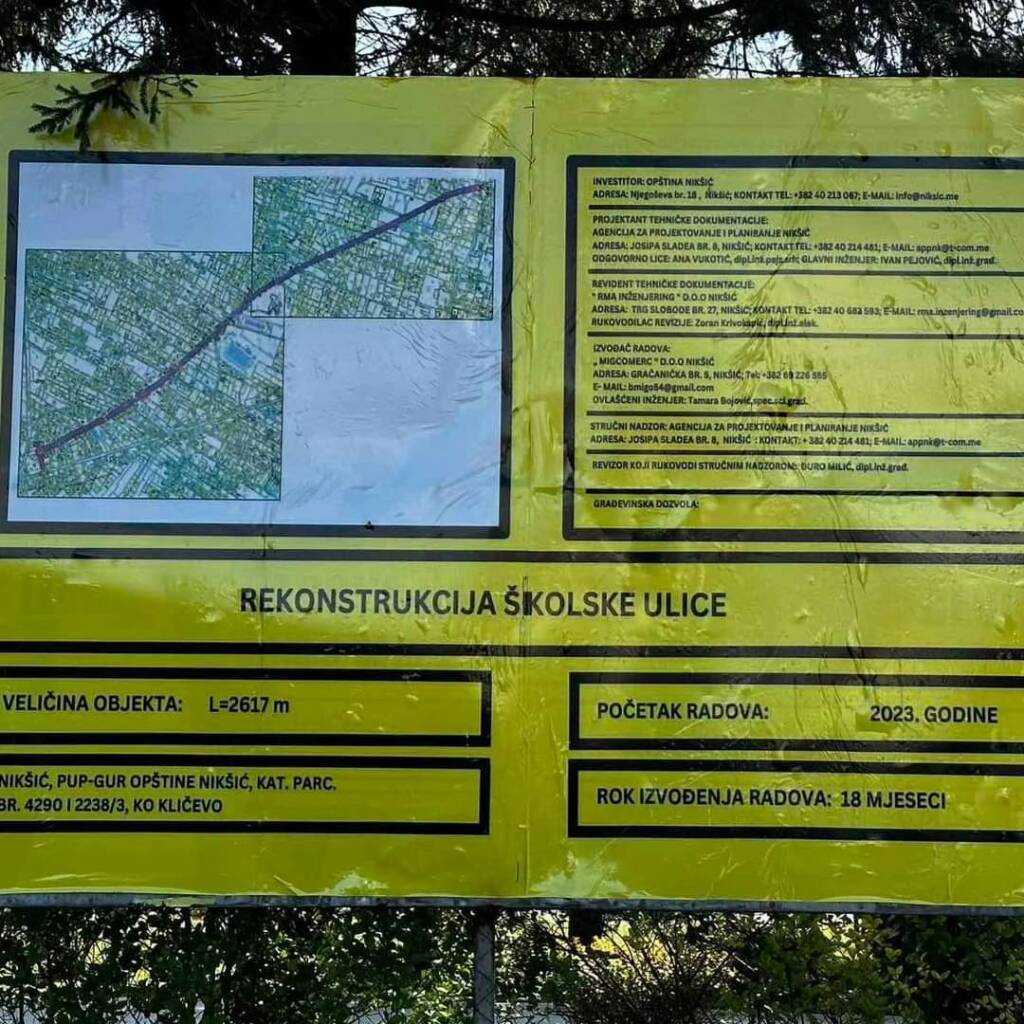Vrijednost rekonstrukcije Školske ulice, u dužini oko 2 kilometra i 600 metara, iznosi dva i po miliona evra. Rok za završetak radova je 18 mjeseci, a izvođač radova je firma Mikomerc iz Nikšića.