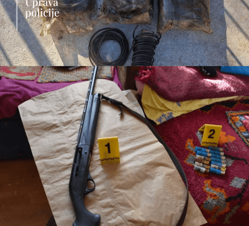 „Izvršen je pretres stana i drugih prostorija koje koristi N.K. i tom prilikom pronađena je i oduzeta lovačka puška za koju se sumnja da je upotrijebljena u izvršenju ovog djela, kao i tri komada lovačkih patrona, 35 komada eksplozivnih detonatorskih štapina i svežanj sporogorećeg štapina“, piše u saopštenju.