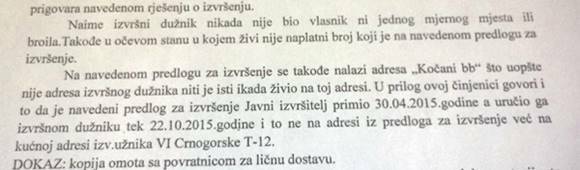 Na rješenju njegovo ime, njegov matični broj, ali adresa Kočani bb. Ostao je kaže zbunjen jer se nijedno brojilo nikad nije vodilo na njega. Pritom je adresa na kojoj je napravljen sporni dug u Kočanima, ali mu je nervozu stvaralo to što je izvršitelj posalo dokumenta na njegovu adresu u Ulici VI Crnogorske T-12. Da stvar bude još gora, nalog za izvršenje je, na njegovu adresu, stigao sa debelih šest mjeseci kašnjenja.