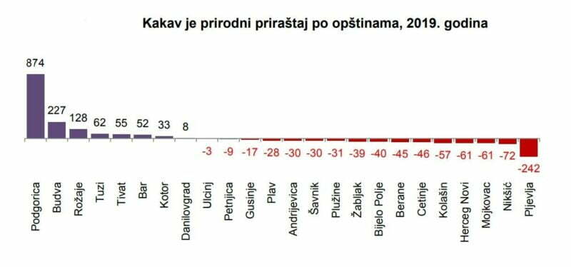 “Najveći prirodni priraštaj je u Podgorici 874, Budvi 227 i Rožajama 128. Pljevlja imaju najveći negativni prirodni priraštaj (-242)”, istakli su statističari.