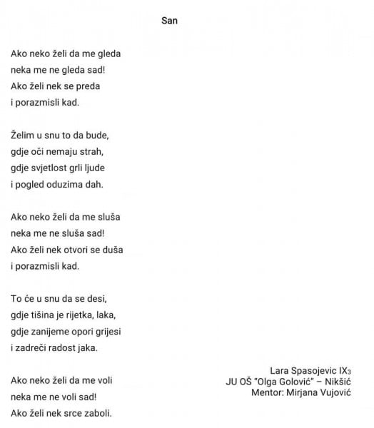 “Pjesme obiluju neobičnim pjesničkim izrazom, bogatog i raznovrsnog sadržaja koje može proizvesti samo dječja mašta i emocija”, naveli su iz pomenute škole.