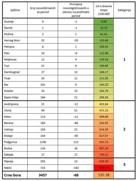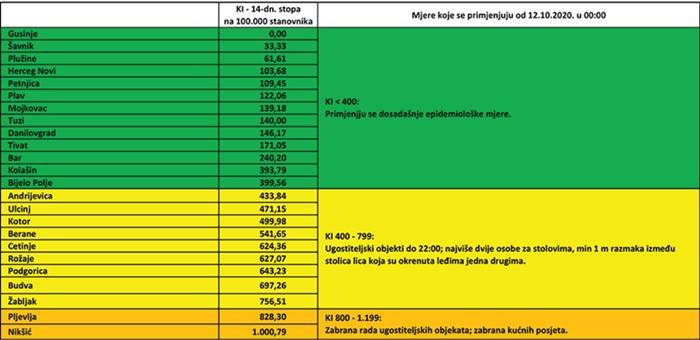 Institut za javno zdravlje objavio listu kumulativne incidencije Kovid-19 za period od 26.09. do 9.10 u 24:00 na osnovu koje se od ponedjeljka primjenjuju nove mjere Nacionalnog koordinacionog tijela.
