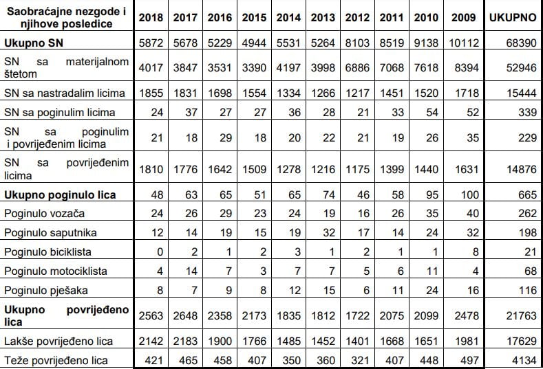 “Od 2013. godine, broj ovih saobraćajnih nezgoda se kreće u rasponu od 45 do 56. U periodu od 2009. godine do 2018. godine, poginulo je ukupno 665 učesnika u saobraćaju. Najveći broj smrtno stradalih lica evidentiran je tokom 2009. i 2010.godine, kada je evidentirano 100, odnosno 95 smrtno stradalih lica”, ističe se u podacima MUP-a.