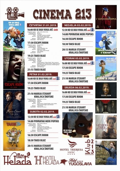 Novi filmovi na repertoaru bioskopa Cinema 213 su animirana komedija „Ko se boji vuka još 2“, naučna fantastika „Escape room“ i drama „Meri Stjuart kraljica Škotske“.