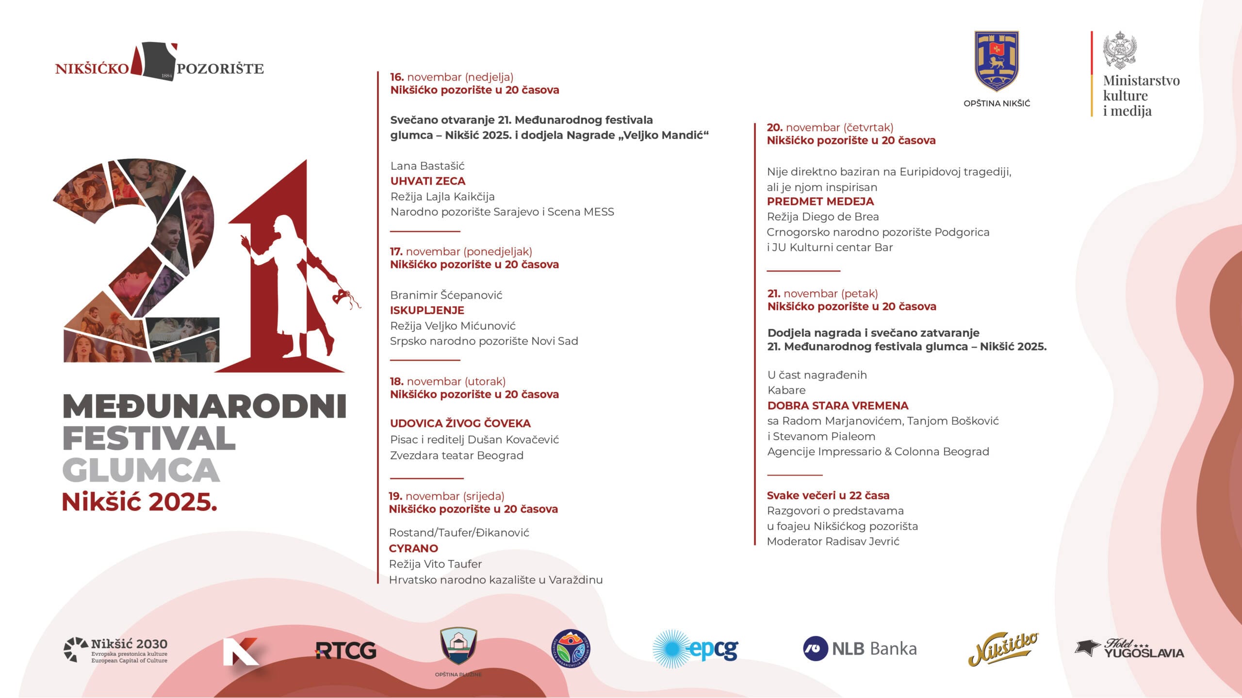 Proglašenje pobjednika i uručenje nagrada predviđeno je za petak (21. novembar), a nakon te svečanosti, u čast nagrađenih biće izveden kabare „Dobra stara vremena” sa Radom Marjanovićem, Tanjom Bošković i Stevanom Pialeom.