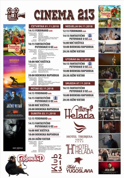 Bioskop Cinema 213 nastavlja sa prikazivanjem noviteta, pa vas ove sedmice čekaju čak tri nova filma – animirana avantura “Fantastično putovanje u Oz”, biografska drama “Boemska rapsodija” i krimi priča devedesetih “Južni vjetar”.