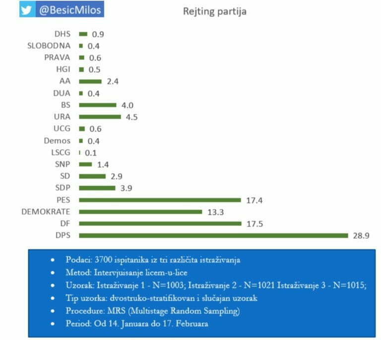 Metodolog prof. dr Miloš Bešić objavio je na Tviteru rezultate novog istraživanja javnog mnjenja. Po toj anketi, Demokratska partija socijalista ima 28,9 odsto podrške građana, Demokratski front 17,5 , Pokret "Evropa sad" 17,4, Demokrate 13,3...