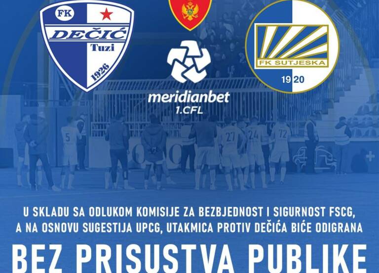 Komisija za bezbjednost i sigurnost Fudbalskog saveza Crne Gore donijela je odluku da se utakmica 33. kola Meridianbet 1. CFL između Dečića i Sutjeske odigra bez prisustva publike, saopšteno je iz Sutjeske na Fejsbuku.
