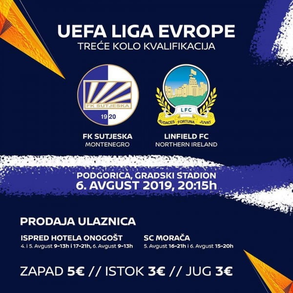 Prodaja ulaznica za prvi meč 3. kola kvalifikacija za Ligu Evrope između Sutjeske i Linfilda počeće sjutra, objavljeno je na zvaničnoj facebook stranici kluba.