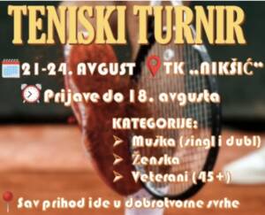 Teniski klub "Nikšić" biće domaćin trećeg po redu humanitarnog teniskog turnira, koji će se održati od 21. do 24. avgusta. Prijave za učešće su otvorene do 18. avgusta, a sav prihod od turnira biće usmjeren u dobrotvorne svrhe.