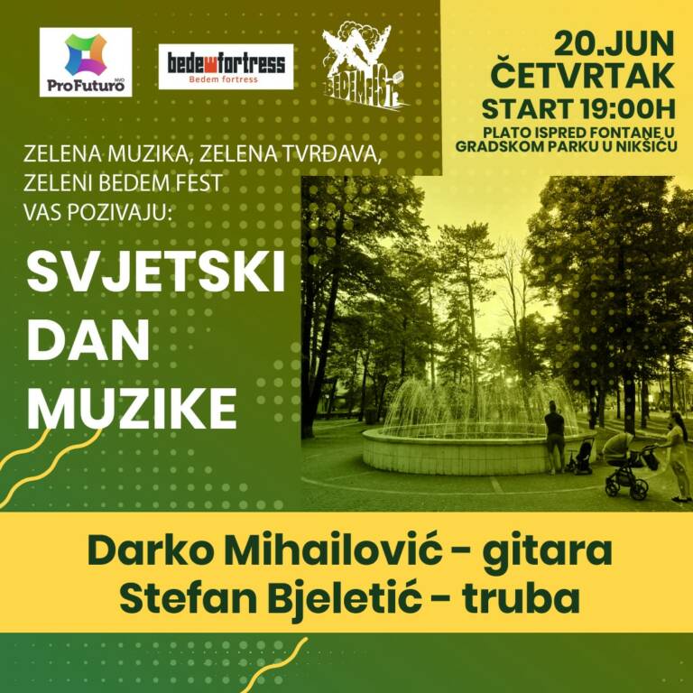 Nevladina organizacija Pro futuro u susret Bedem festu večeras, sa početkom u 19 časova, a povodom Svjetskog dana muzike, organizuje svirku Darka Mihailovića i Stefana Bjeletića, koja će se po prvi put, kako su naveli, održati na platou kod fontane u Gradskom parku.
