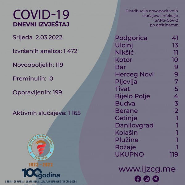 U toku jučerašnjeg dana analizirano je 1.472 uzorka i otkirveno 119 novoboljelih slučajeva.