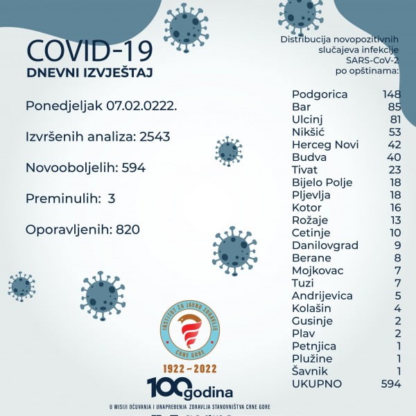 U Crnoj Gori, u posljednja 24 sata od posljedica koronavirusa preminule su tri osobe, a registrovana su 594 nova slučaja infekcije, saopšteno je iz Instituta za javno zdravlje (IJZ).