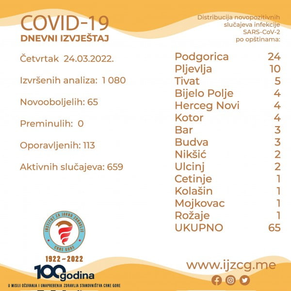 U Crnoj Gori u posljednja 24 sata registrovano je 65 novih slučajeva infekcije, na obrađenih 1.080 uzorka.