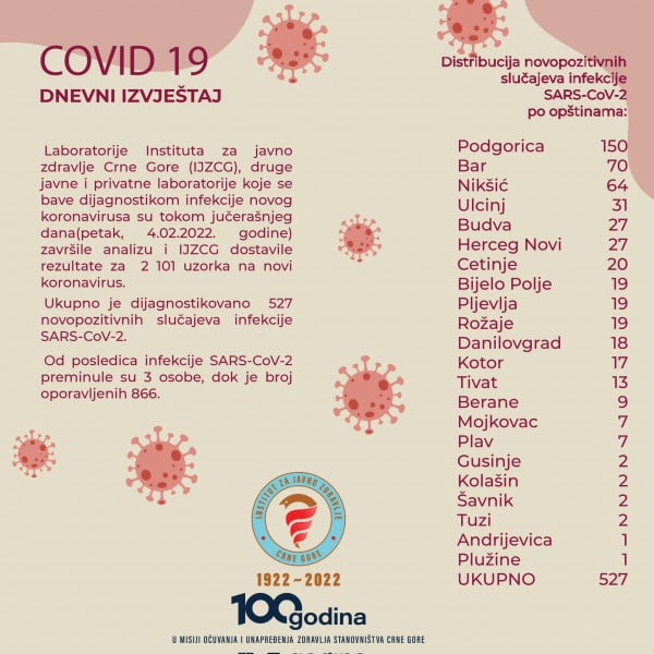 Laboratorije Instituta za javno zdravlje Crne Gore (IJZCG), druge javne i privatne laboratorije koje se bave dijagnostikom infekcije novog koronavirusa su tokom jučerašnjeg dana (petak 04.02.2022. godine) završile analizu i IJZCG dostavile rezultate za 2.101 uzorka na novi koronavirus.