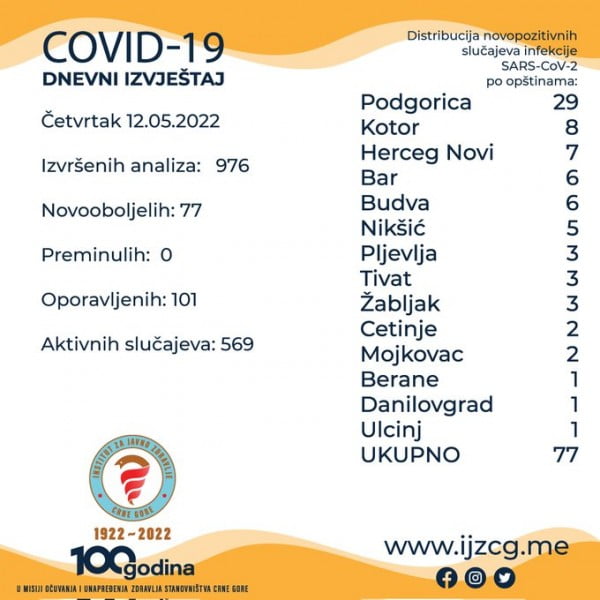 Iz Instituta za javno zdravlje (IJZ) saopšteno je da su njihove i druge javne i privatne laboratorije koje se bave dijagnostikom infekcije koronavirusa tokom srijede završile analizu i dostavile rezultate za 976 uzoraka.