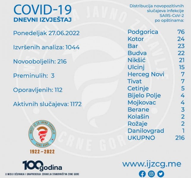 Institut za javno zdravlje Crne Gore (IJZCG), druge javne i privatne laboratorije su tokom ponedjeljka završile analizu 1.044 uzorka i potvrdile 216 novih slučajeva koronavirusa.