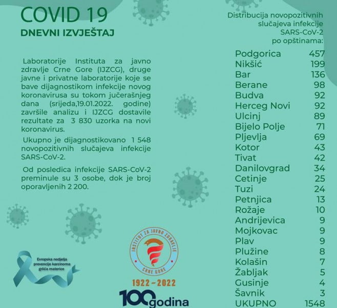 U Crnoj Gori, u posljednja 24 časa, registrovano je 1.548 novih slučajeva koronavirusa, podaci su Instituta za javno zdravlje. Preminule su tri osobe iz Bara, Podgorice i Herceg Novog. Među preminulima najmlađa je imala 73 godine, a najstarija 89 godina starosti.
